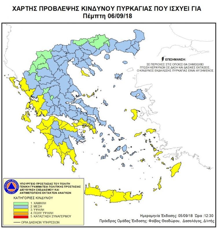 Σύμφωνα με πρόβλεψη της Γενικής Γραμματείας Πολιτικής Προστασίας, για αύριο Πέμπτη 6 Σεπτεμβρίου 2018, περιοχές της Δυτικής Ελλάδας, βρίσκονται στην κατηγορία κινδύνου 3, όπως φαίνεται στον επισυναπτόμενο ημερήσιο Χάρτη Πρόβλεψης Κινδύνου Πυρκαγιάς. Για το λόγο αυτό, οι πολίτες πρέπει να αποφεύγουν εργασίες και ενέργειες που μπορεί να προκαλέσουν πυρκαγιά από αμέλεια, όπως ρίψη αναμμένου τσιγάρου, καύση υπολειμμάτων καλλιεργειών, χρήση μηχανημάτων τα οποία υπάρχει πιθανότητα να προκαλέσουν σπινθήρα, χρήση υπαίθριων ψησταριών κ.ά.