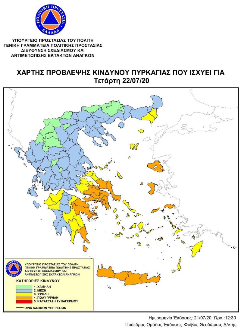 Σύμφωνα με την πρόβλεψη της Γενικής Γραμματείας Πολιτικής Προστασίας, η Περιφερειακή Ενότητα Αχαΐας και τμήματα της Περιφερειακής Ενότητας Ηλείας θα βρίσκονται στην κατηγορία κινδύνου 3 (υψηλή), την Τετάρτη 22 Ιουλίου 2020, όπως φαίνεται στον επισυναπτόμενο ημερήσιο Χάρτη Πρόβλεψης Κινδύνου Πυρκαγιάς.