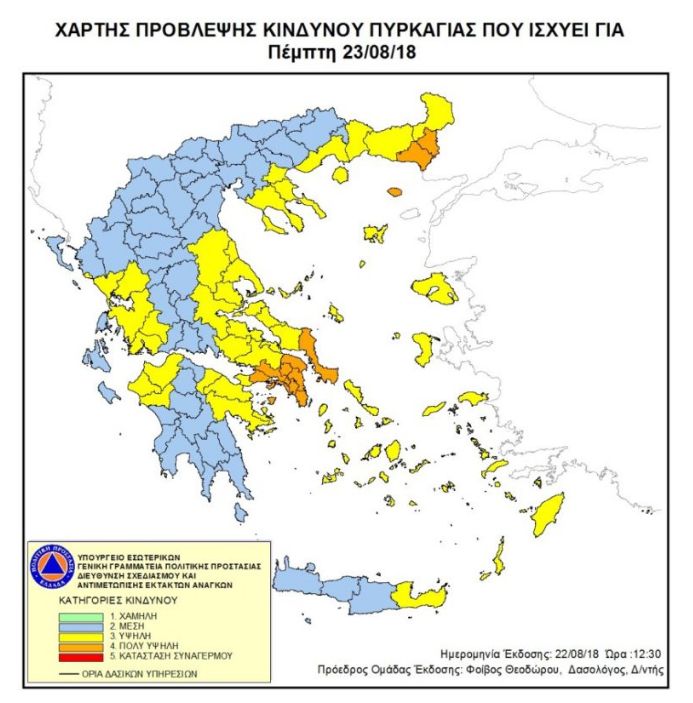 Σύμφωνα με πρόβλεψη της Γενικής Γραμματείας Πολιτικής Προστασίας, για αύριο Πέμπτη 23 Αυγούστου 2018, περιοχές της Δυτικής Ελλάδας, βρίσκονται στην κατηγορία κινδύνου 3, όπως φαίνεται στον ημερήσιο Χάρτη Πρόβλεψης Κινδύνου Πυρκαγιάς.