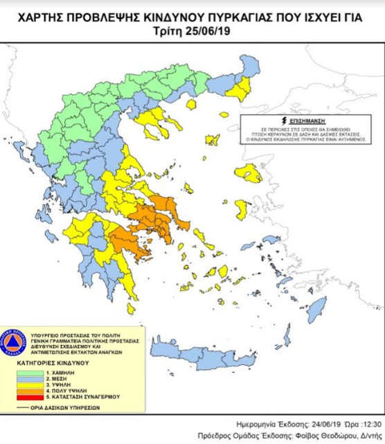 Σύμφωνα με πρόβλεψη της Γενικής Γραμματείας Πολιτικής Προστασίας, οι Περιφερειακές Ενότητες Αχαΐας και Ηλείας, την Τρίτη 25 Ιουνίου 2019, θα βρίσκονται στην κατηγορία κινδύνου 3 (υψηλή), όπως φαίνεται στον επισυναπτόμενο ημερήσιο Χάρτη Πρόβλεψης Κινδύνου Πυρκαγιάς.