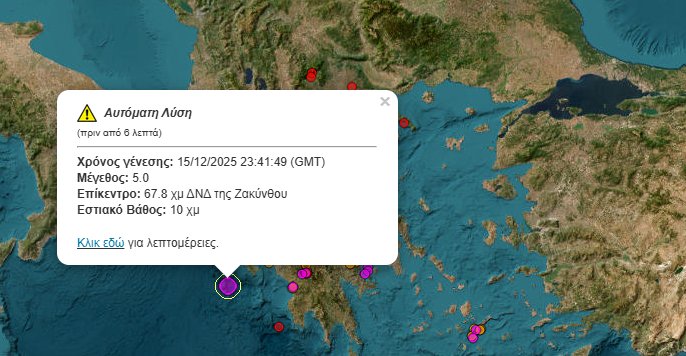 Σεισμός σημειώθηκε στις 12:41 σήμερα, Τρίτη, 16 Δεκεμβρίου 2025, 55 χιλιόμετρα Νοτιοδυτικά της Ζακύνθου.