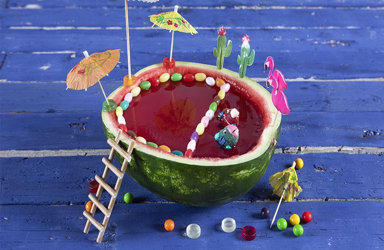 Αφαιρούμε από το ψυγείο και διακοσμούμε το ζελέ με τα καραμελάκια, τα ζελεδάκια ψαράκια, και καρφώνουμε στο καρπούζι τα χάρτινα κακτάκια και φλαμίνγκο.